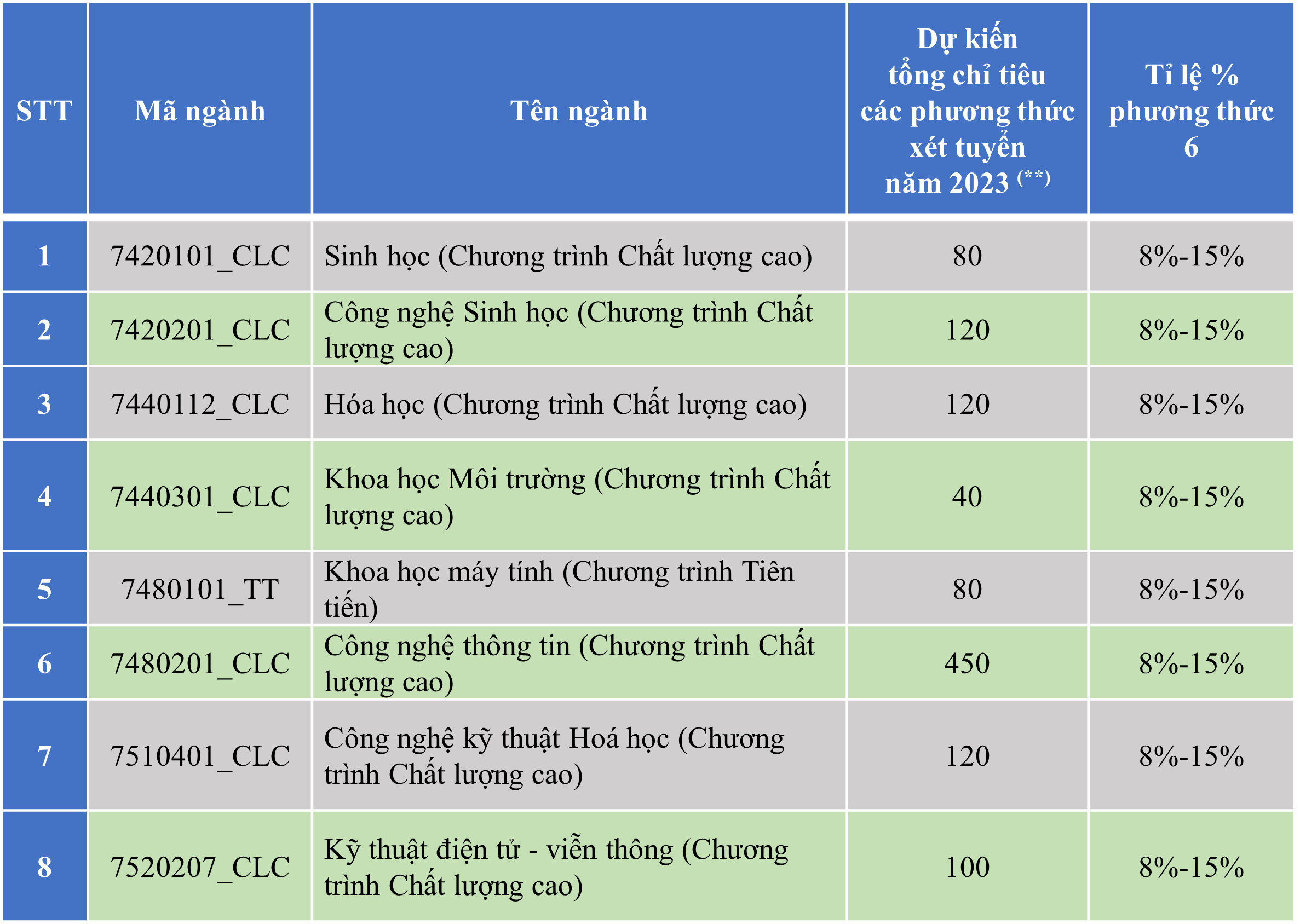 Chỉ tiêu xét tuyển phương thức này từ 8% đến 15% trên tổng chỉ tiêu theo ngành/nhóm ngành năm 2023 theo bảng sau đây: