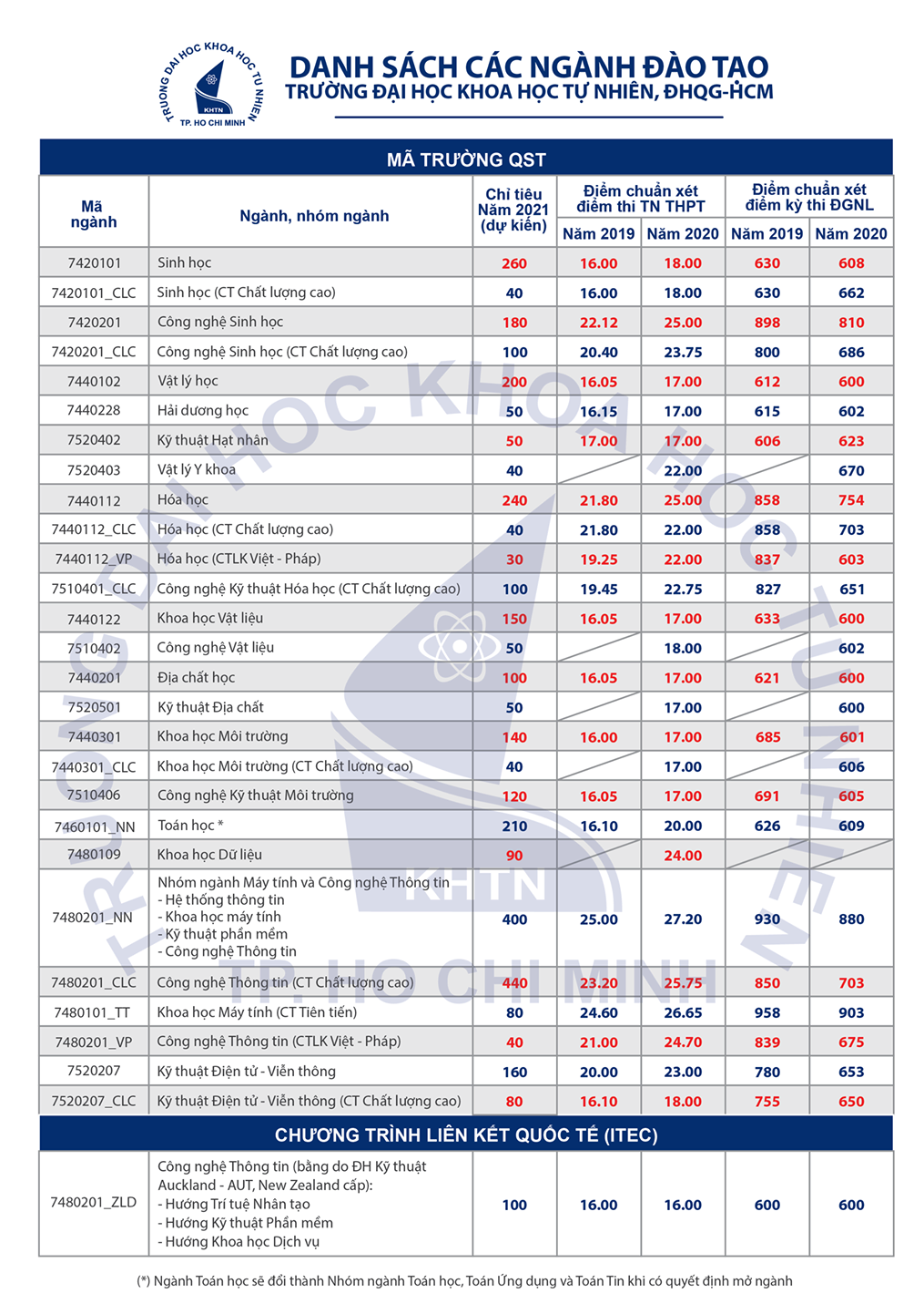 Năm 2021, Trường ĐH Khoa học Tự nhiên (ĐH Quốc gia TP.HCM) tuyển sinh tổng chi tiêu khoảng gần 3.600 theo 5 phương thức, các phương thức xét tuyển đều yêu cầu thí sinh phải đáp ứng điều kiện chung là tốt nghiệp THPT: