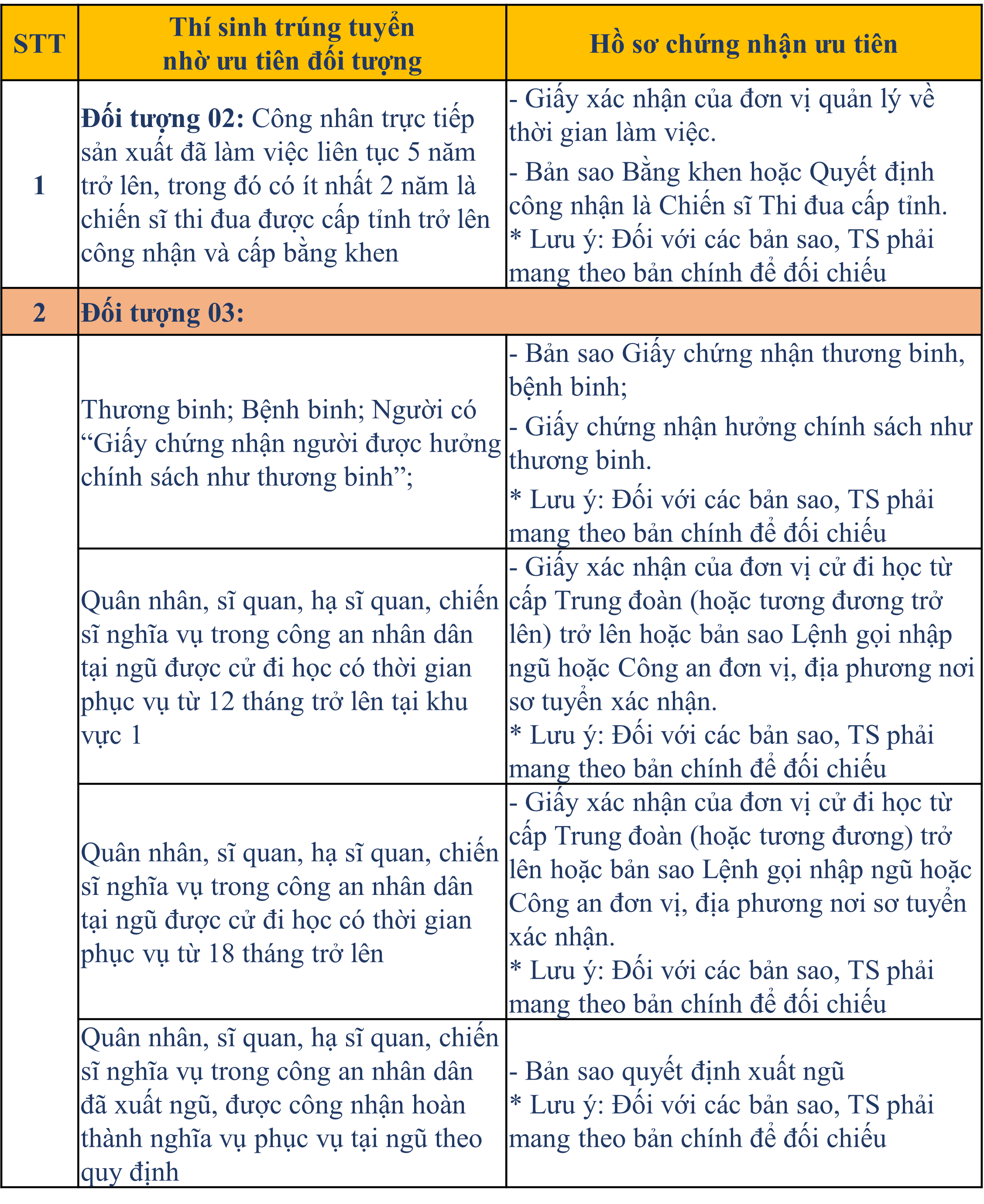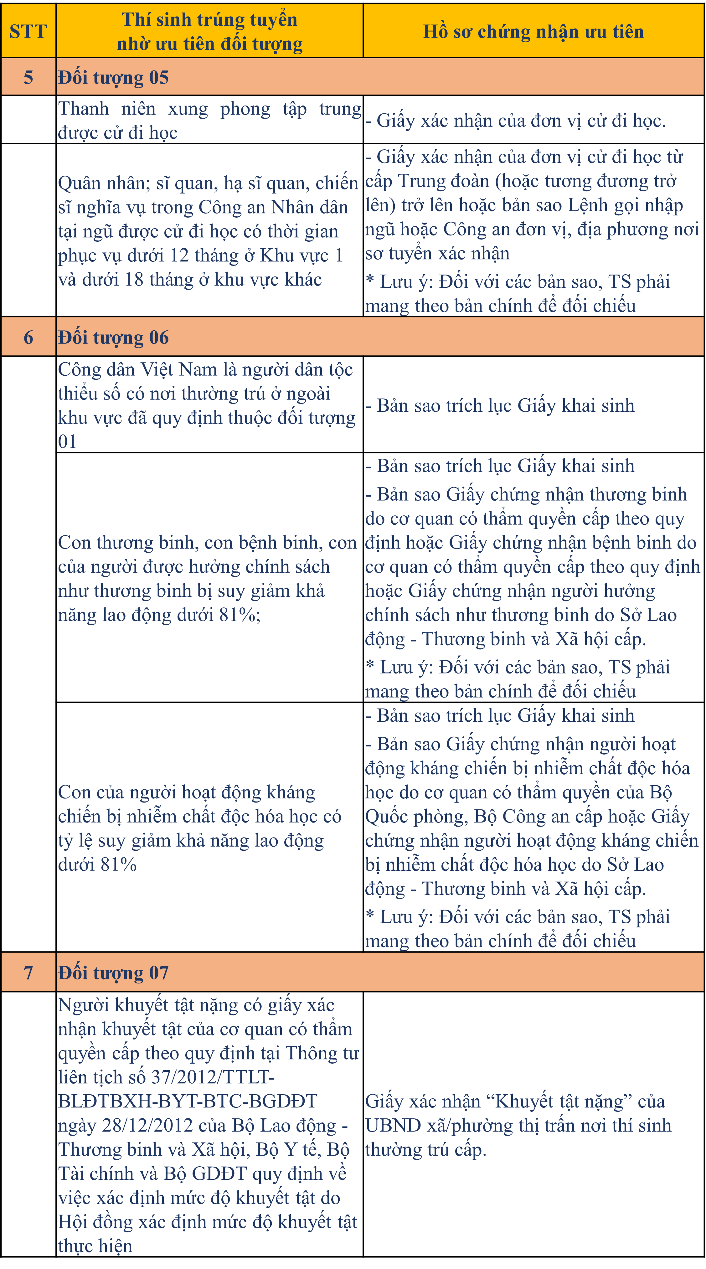 b) TS trúng tuyển nhờ ưu tiên đối tượng 02 đến đối tượng 07: nộp các giấy tờ minh chứng ưu tiên đối tượng theo bảng tại mục Hồ sơ chứng nhận ưu tiên.