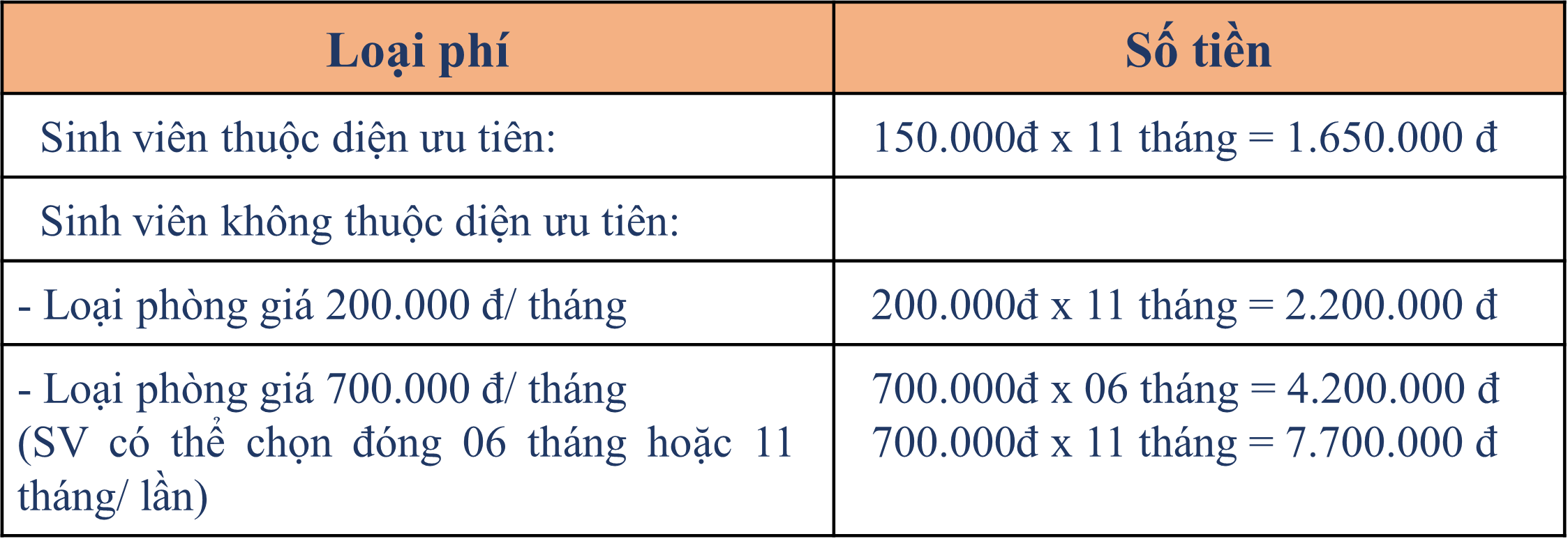 - Lệ phí phòng ở năm học 2023-2024 đến năm học 2025-2026: xem phụ lục tại đây