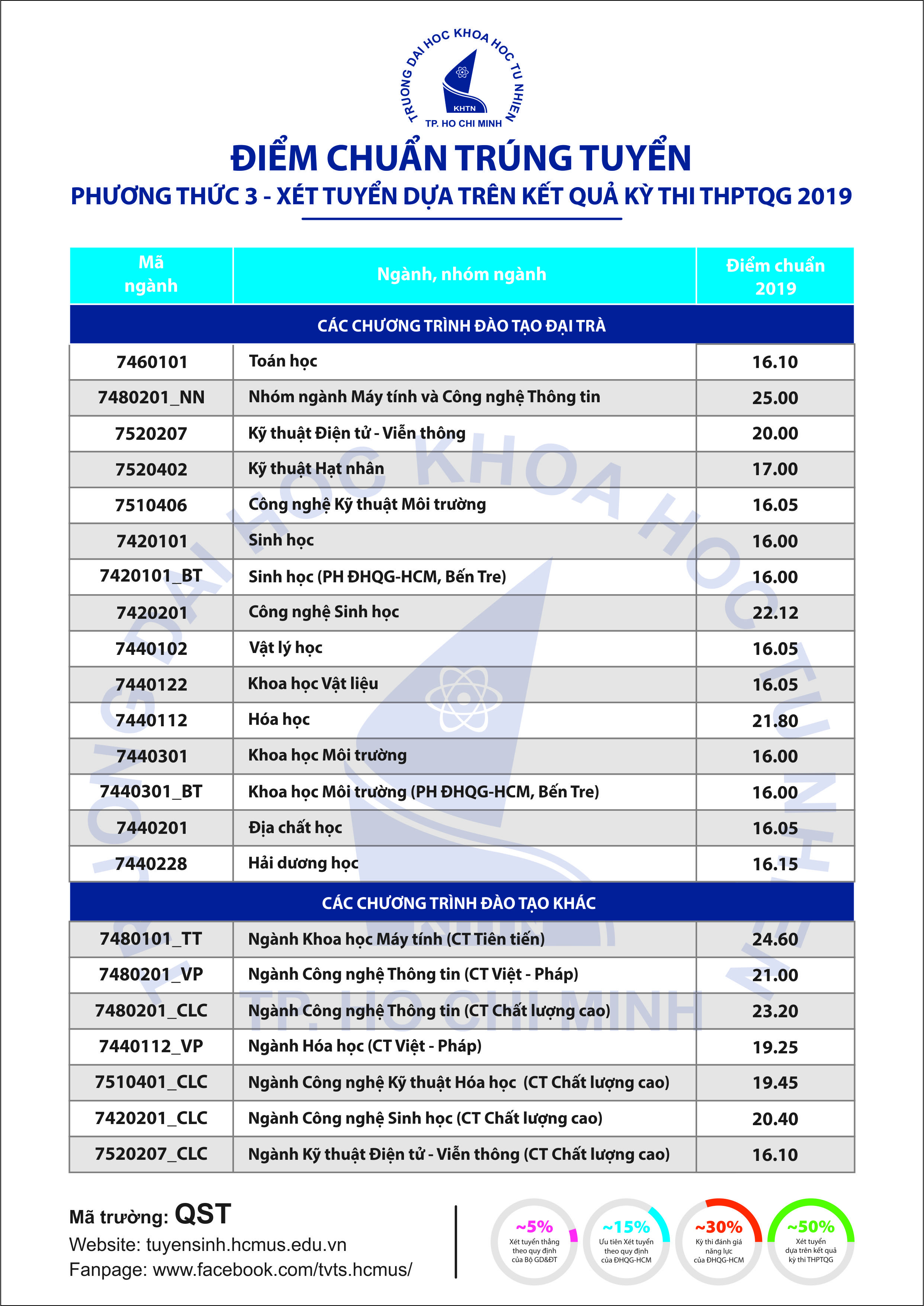 Lưu ý: Các thí sinh trúng tuyển các chương trình đặc biệt phải theo dõi các yêu cầu về thông tin kiểm tra trình độ ngoại ngữ trên trang web của Trường theo địa chỉ: tuyensinh.hcmus.edu.vn.